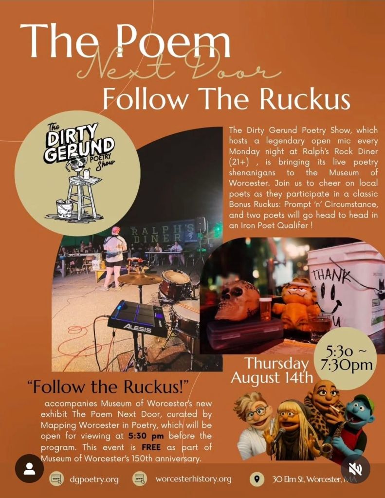 The Dirty Gerund Poetry Show has been invited to bring the ruckus to the Museum of Worcester ~ Thursday August 14th 5:30~7:30 (ALL AGES FREE) ; We will be hosting a classic Bonus Ruckus, Prompt n Circumstance, where poets will have been given an object that they will write a poem about ON that very object, in a showcase of some of regular purveyors alongside some new friends who want to get a taste of the sacrament!