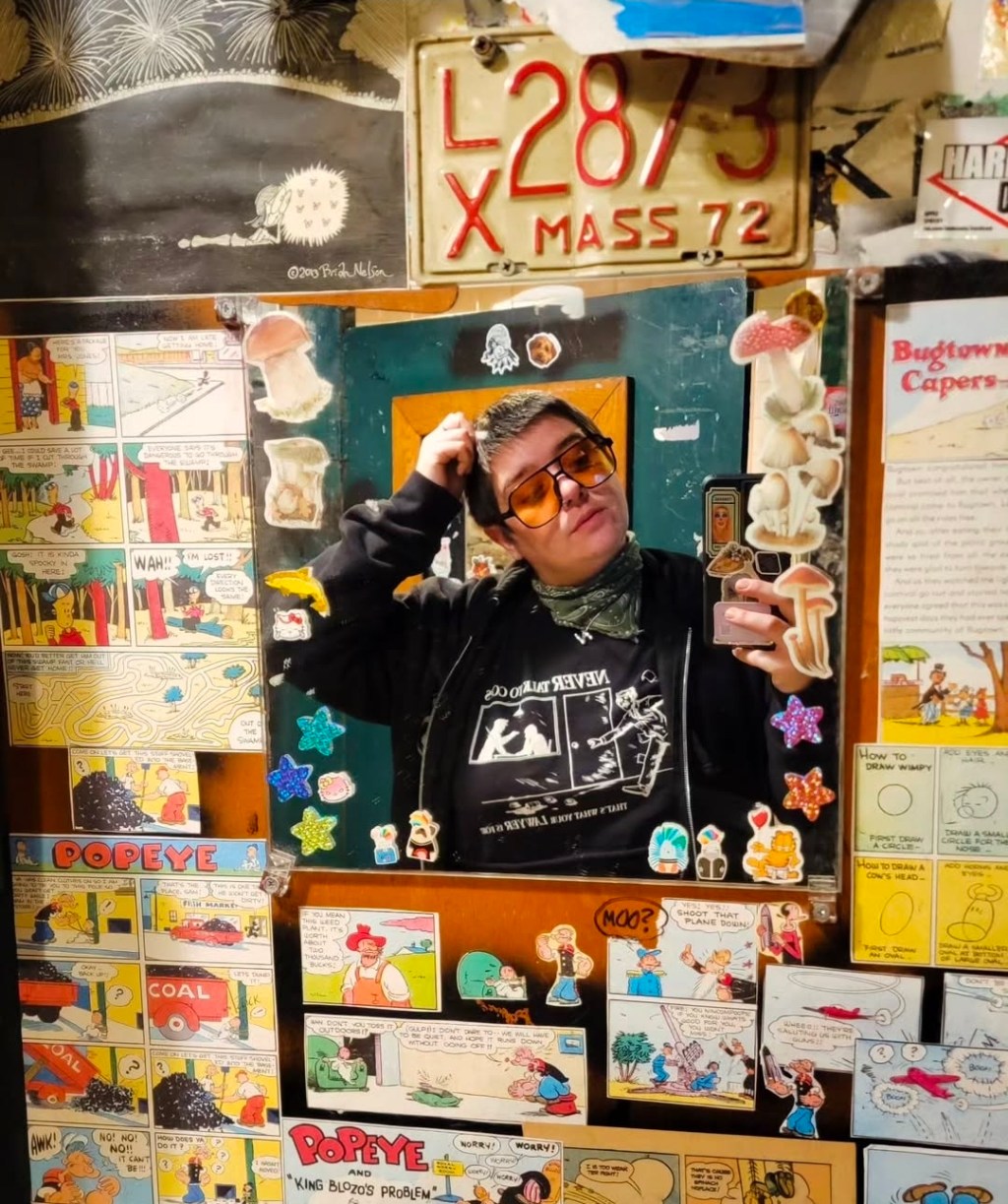 Our Birthday Feature, this Monday: Nark Lizard is a poet, photographer, hypeman, and local cryptd of Worcester, Massachusetts. Often described as the love child of Gonzo the Muppet and Fran Fine. As stated by another local poet mastermind “Along time ago Nark Lizard didnt exist and historians call that the Dark Ages. They were born here to make art, build community and make Worcester a place worth living.” They are currently the curator of The Dirty Gerund Poetry Show held at Ralph’s Rock Diner for the last 15+ years. Lizard uses poetry as an outlet to process grief, living with schizophrenia, depression and disordered eating. They hope to show the people of Worcester what poetry really means to this city and continue to grow this renaissance we are currently living through. You can usually hear them yelling a compliment at someone before you see them and find them with a cigarette and/or red bull in hand.